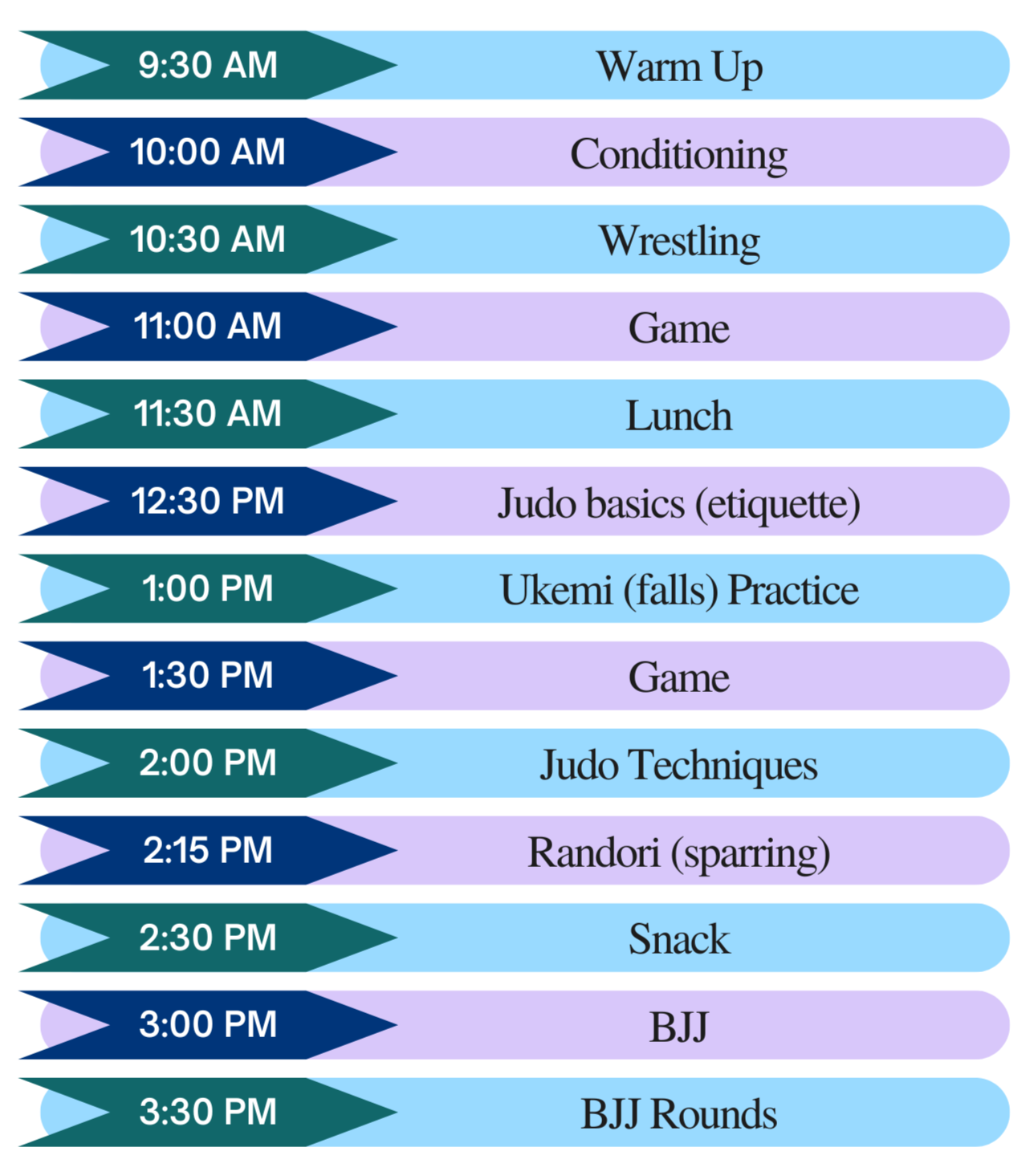 Here is a sample schedule of what our day looks like! The first half of camp will consist of various activities taught by different instructors, from Wrestling to Taekwondo to Capoeira, as well as some fun group games! We then break for lunch, clean up and get suited up into our Judo or BJJ gi. From there, our instructors will go through every aspect of Judo and BJJ.